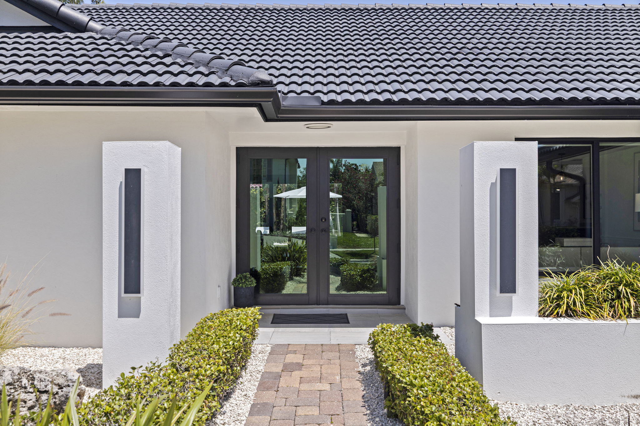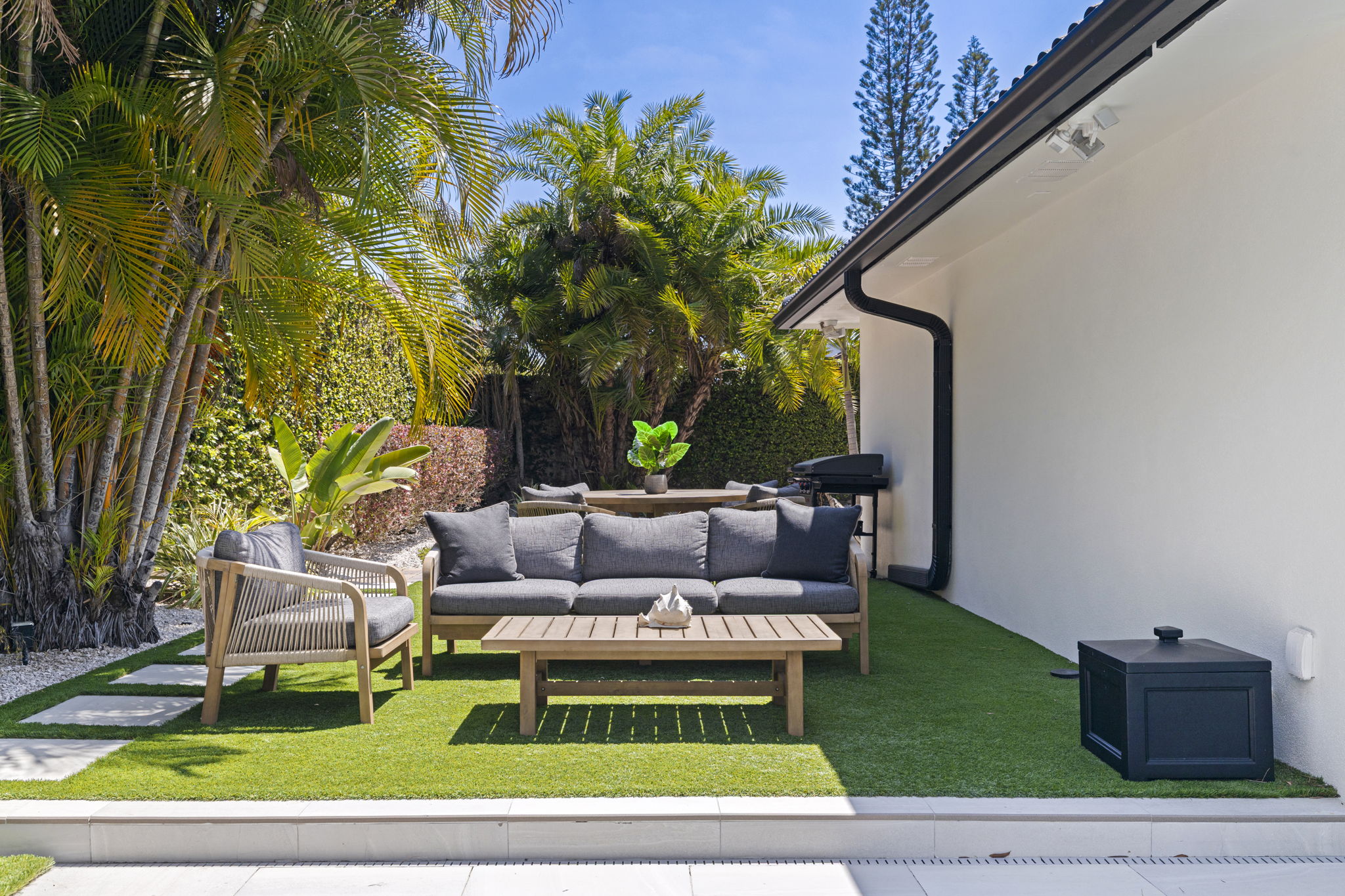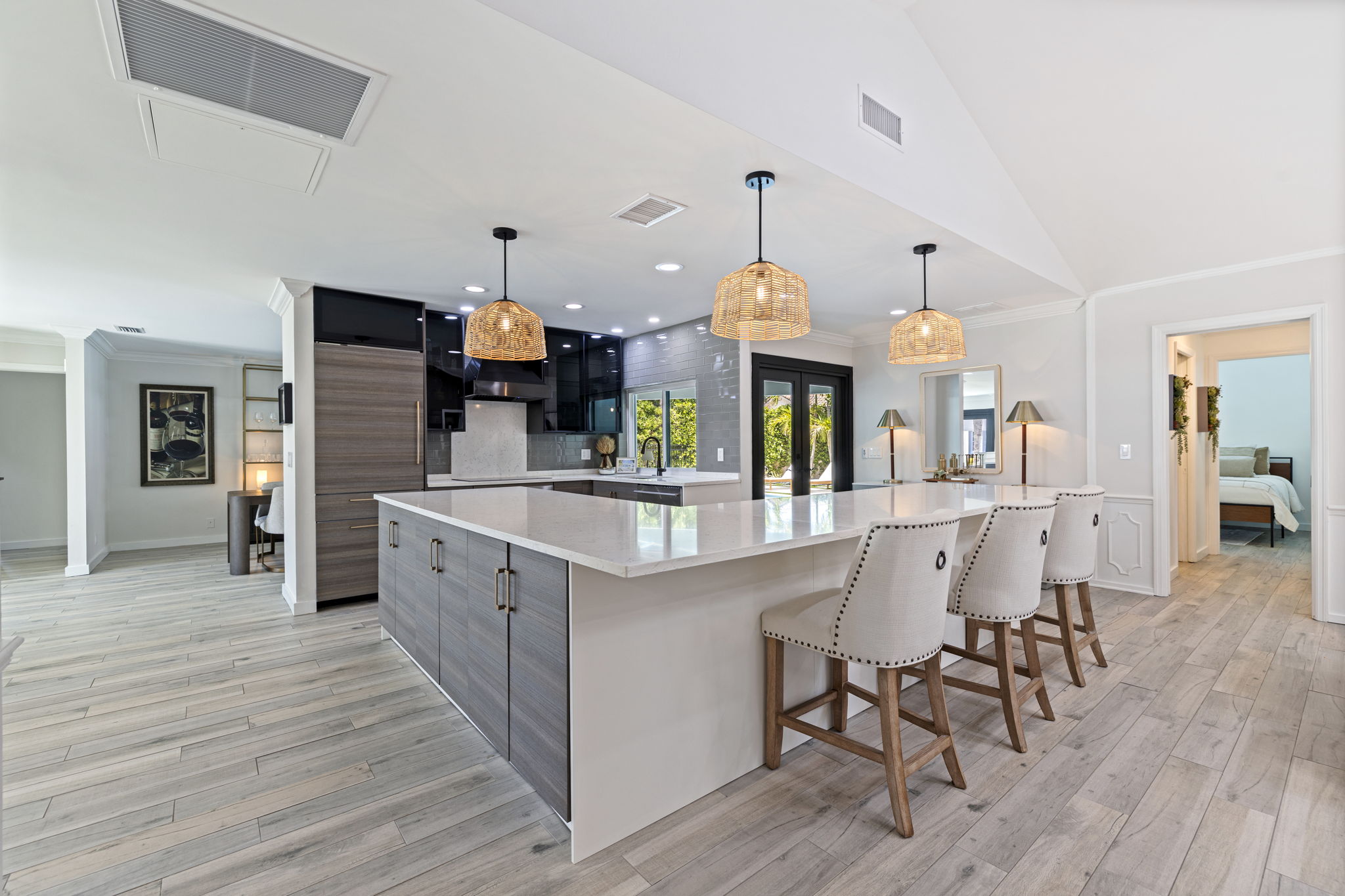 The primary suite opens directly to the backyard and includes a custom walk-in closet and an updated bath with dual vanities, soaking tub, and a glass-enclosed walk-in shower. Outdoor living is centered around a private, fully fenced and walled backyard with mature tropical landscaping. The heated saltwater pool has been completely rebuilt and features a quartz aggregate surface, marble coping, waterfall feature, custom lighting, and porcelain paver decking.