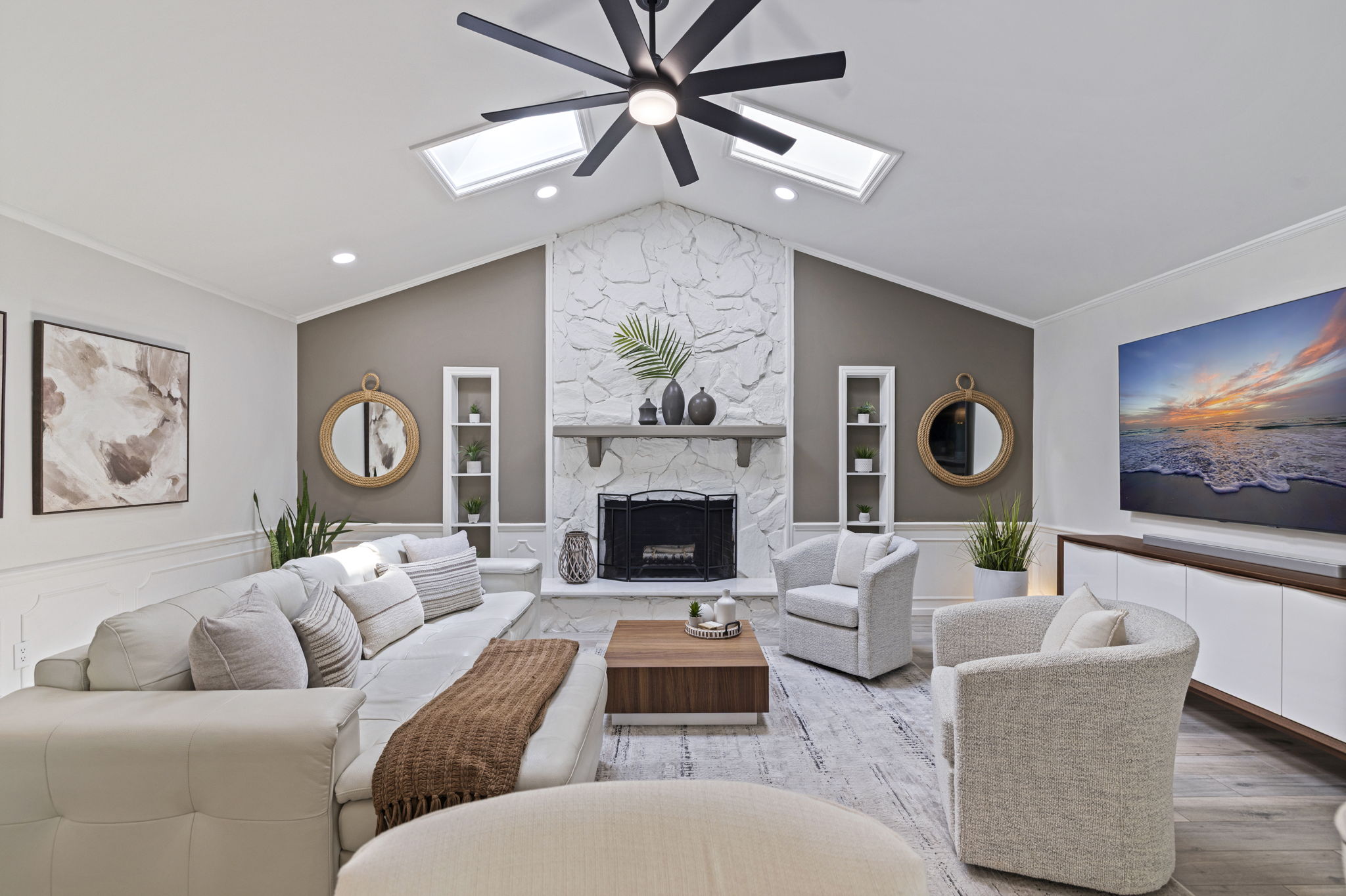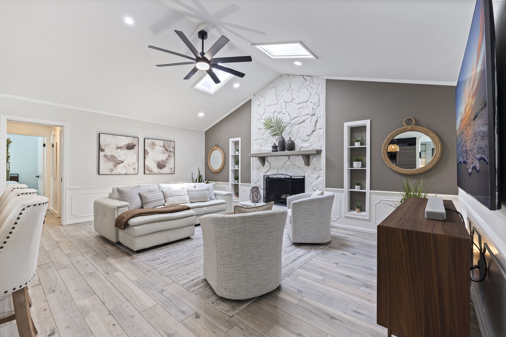 The main living areas feature vaulted ceilings, skylights, crown molding, automated blinds, and a wood-burning fireplace, creating a bright and open environment. The kitchen is designed for both daily living and entertaining, featuring an oversized island, quartz countertops, custom cabinetry, GE Monogram appliances, and an electric cooktop.