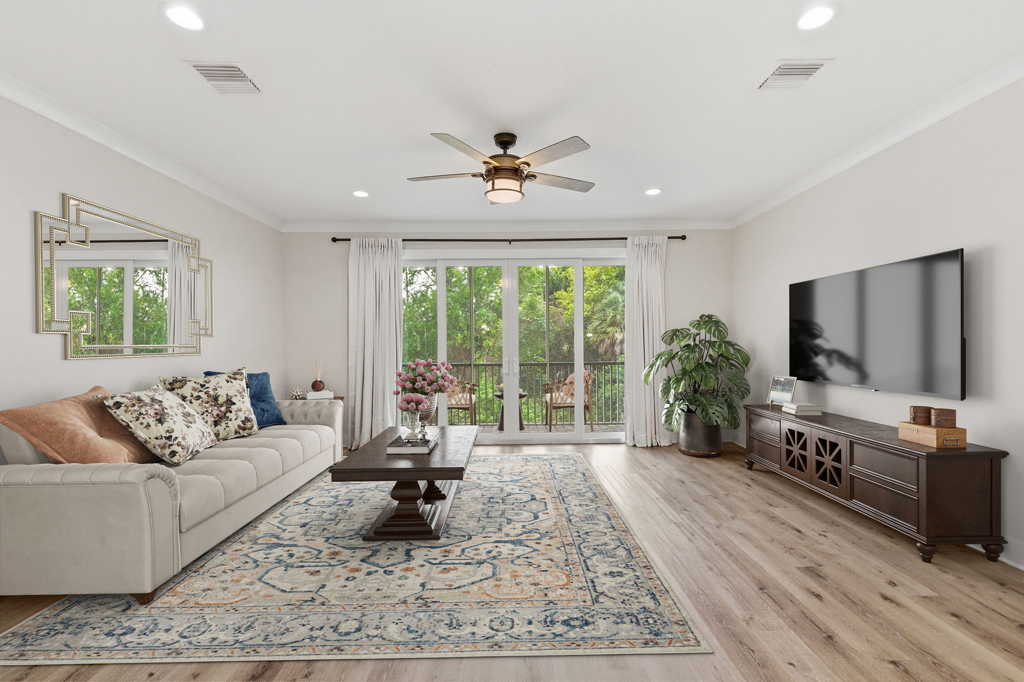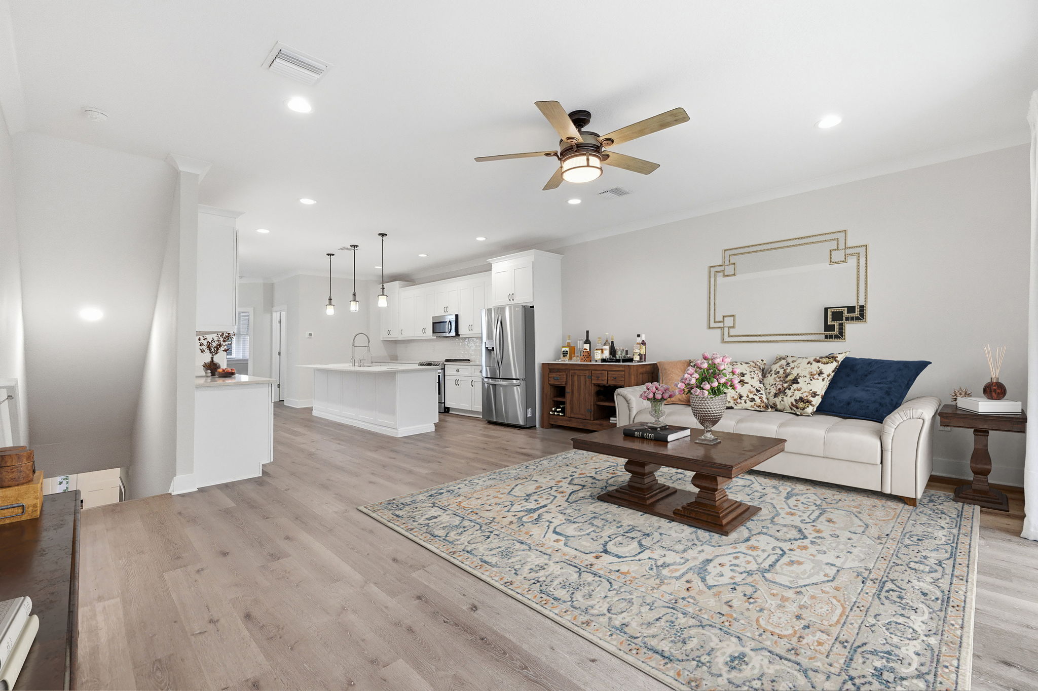 Built in 2021, this 3 bedroom plus office, 2.5 bath townhome offers 2,310 heated square feet with a layout designed for both everyday living and flexibility. The main living area is elevated above the garage and features an open floor plan with high ceilings and a screened, covered balcony overlooking a private wooded setting with no rear neighbors.