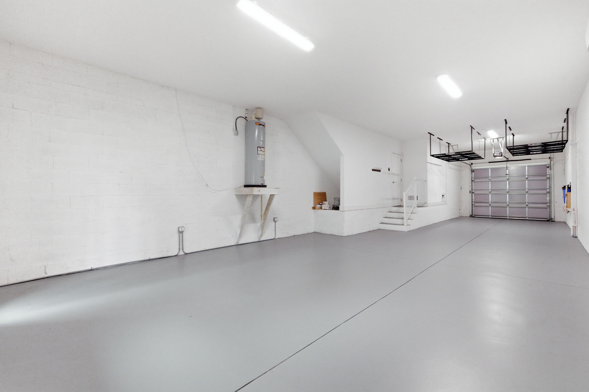 The oversized garage accommodates up to four vehicles and offers flexibility for storage, a workshop, gym, or hobby space. It includes a mini split system, insulated garage door, overhead storage, and a 50 amp outlet suitable for EV charging.